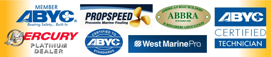 MEMBER ABYC Boating Safety... Built In, Propspeed Prevents Marine Fouling, AMERICAN BOAT BUILDERS & REPAIRERS ASSOCIATION ABBRA Founded 1943, ABYC CERTIFIED TECHNICIAN, MERCURY PLATINUM DEALER, CERTIFIED TO ABYC STANDARDS, WEST MARINE PRO