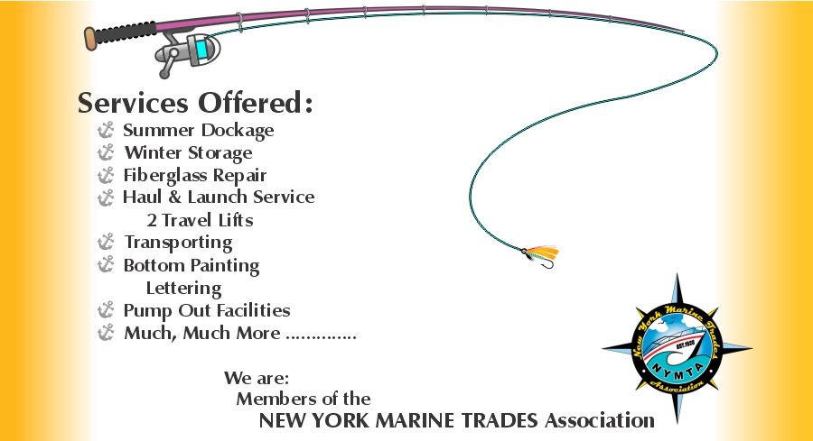 Services Offered:Summer Dockage, Winter Storage, Fiberglass Repair, Haul & Launch Service: 2 Travel Lifts, Transporting, Bottom Painting, Lettering, Pump Out Facilities, Much, Much More ..............